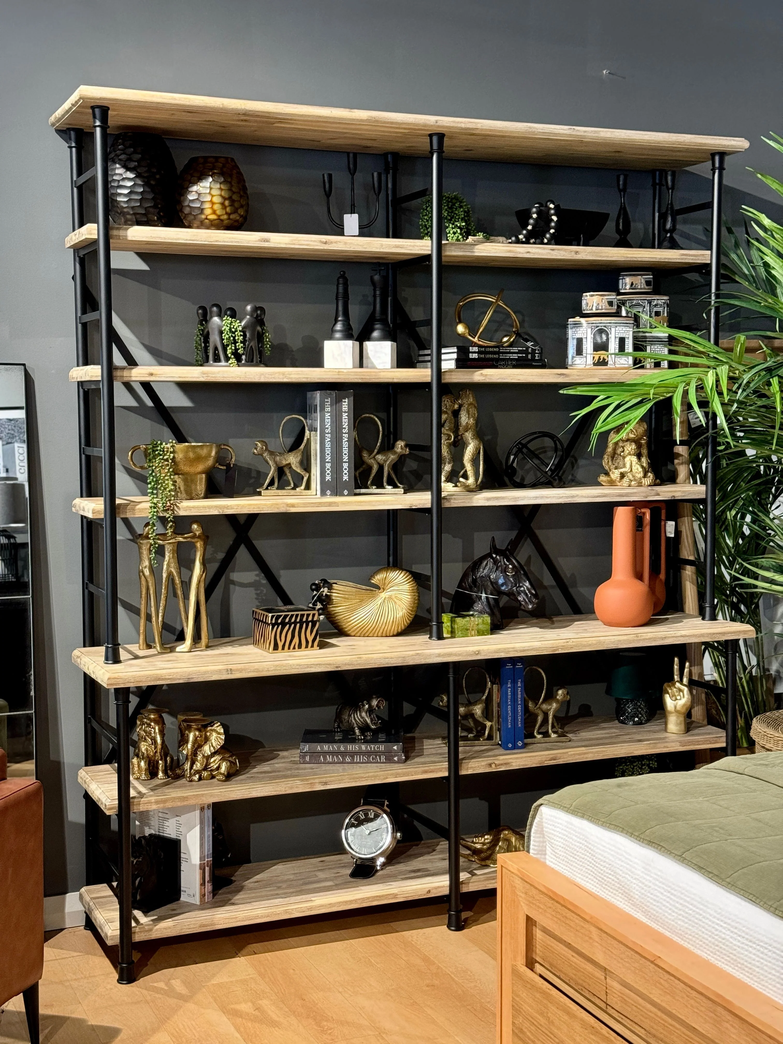 The Beck Industrial Open Shelf features a robust black metal frame complemented by beautifully driftwood-toned timber shelves, creating a perfect balance of modern design and natural warmth. Featuring six spacious shelves providing ample room for showcasing your treasured décor.