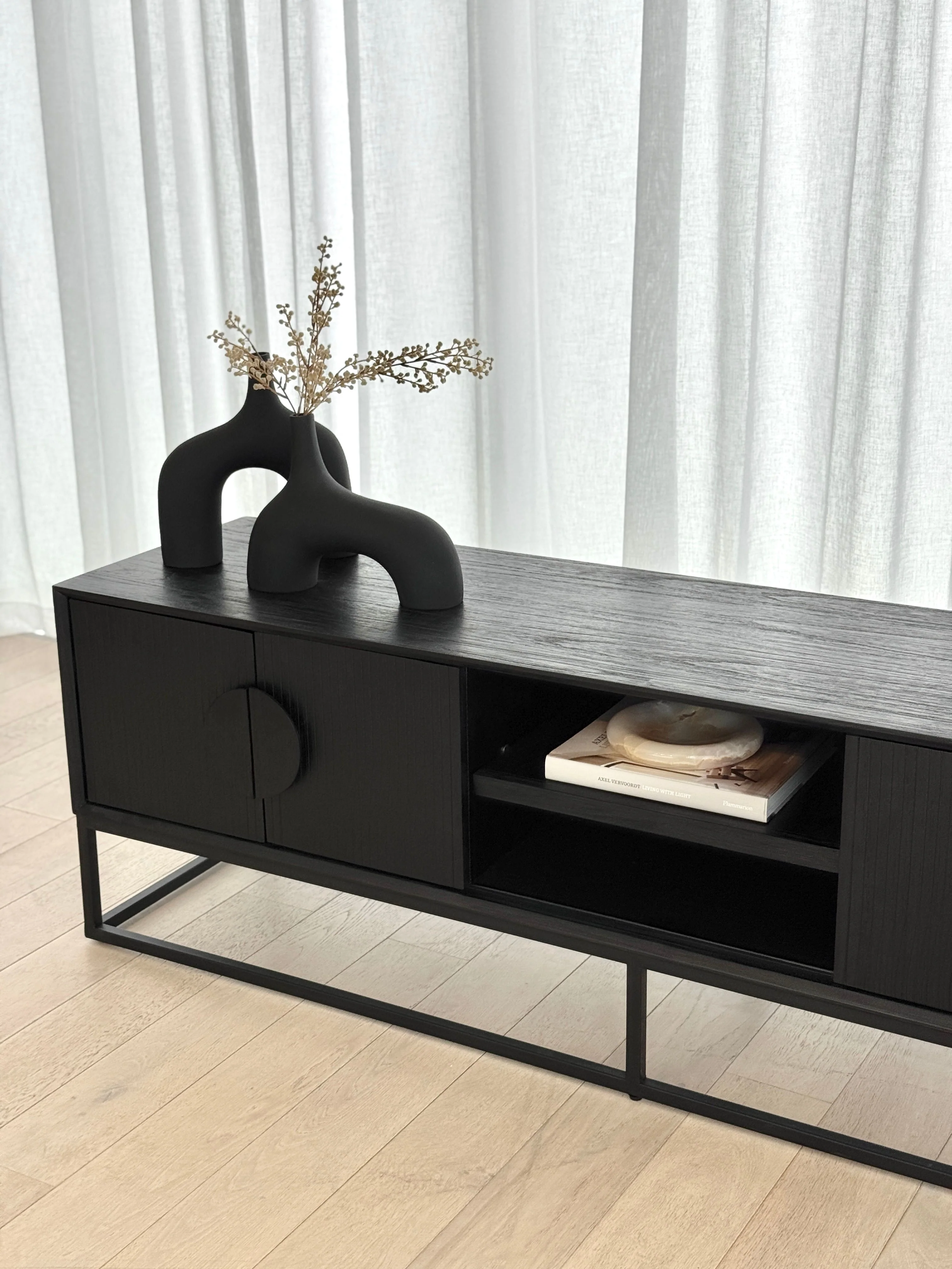 The Edina Entertainment Unit brings together sleek design and sophistication with its rich, dark mountain ash veneer finish. Featuring ribbed cupboard door fronts and large, eye-catching round handles, this piece adds a touch of modern elegance to any space. Matte black metal legs complete the contemporary look.