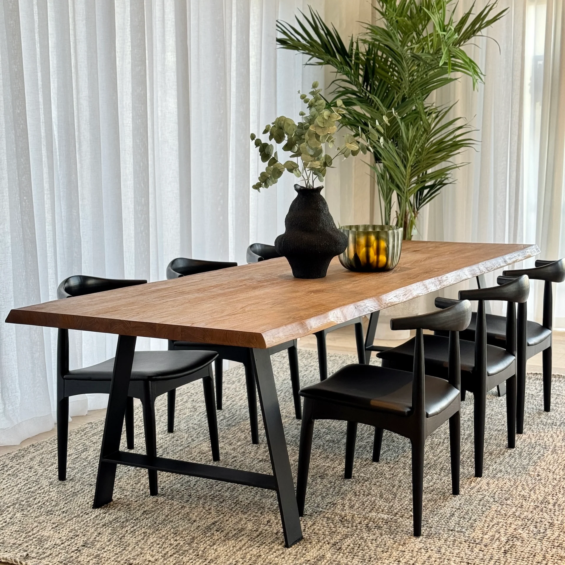 This elbow chair pays homage to the original design of prolific Danish furniture designer Hans Wegner, featuring all the elements that make this minimalist piece a timeless classic. The curved backrest, crafted from elm painted black, provides elbow and lower back support, while the black vegan leather seat-pad optimises comfort.