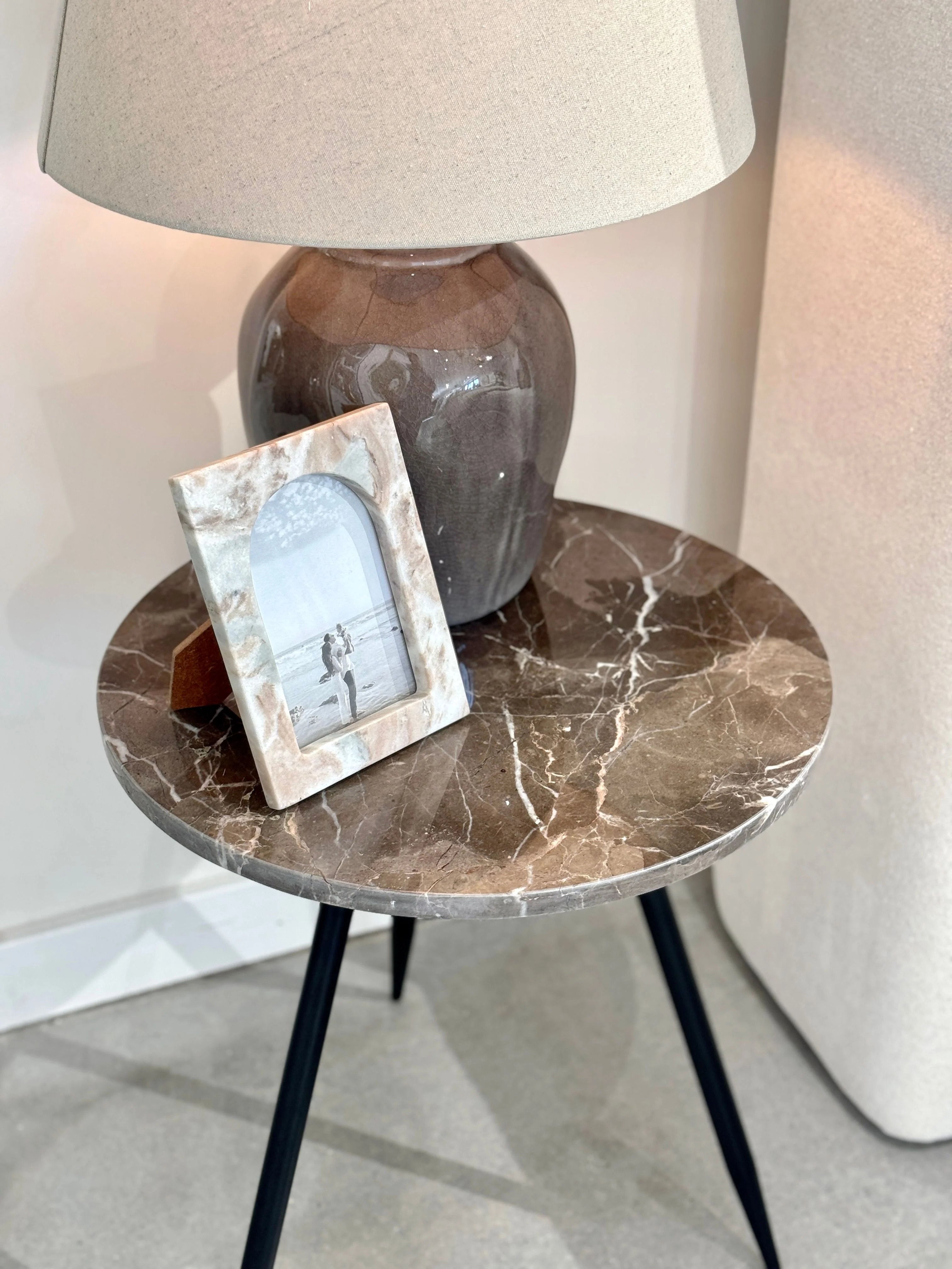 The Ingle Marble Side Table features a stunning warm, earthy marble top that showcases unique veining, making each piece one of a kind. A harmonious blend of industrial design and natural elegance, featuring black metal tripod legs that provide a sleek, modern foundation. Style separately or layer together.