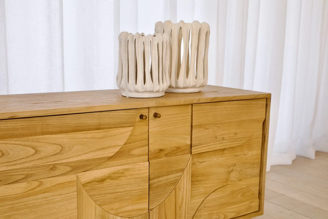 The Juniper 4 Door Entertainment Unit combines natural beauty with thoughtful craftsmanship. Made from sustainably sourced Sungkai timber, this piece displays a light, airy tone and exquisite natural grain that enhances its organic charm. Circular carvings on the doors and brass handles add artistic detail and texture.