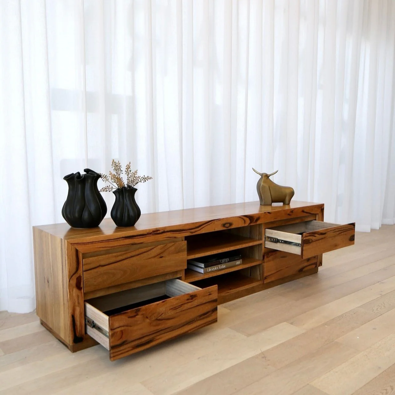 This stunning entertainment unit is a timeless piece that highlights the natural beauty of Western Australia. Featuring four spacious drawers, it is expertly crafted from premium Marri timber, showcasing its distinctive grain and warm tones.