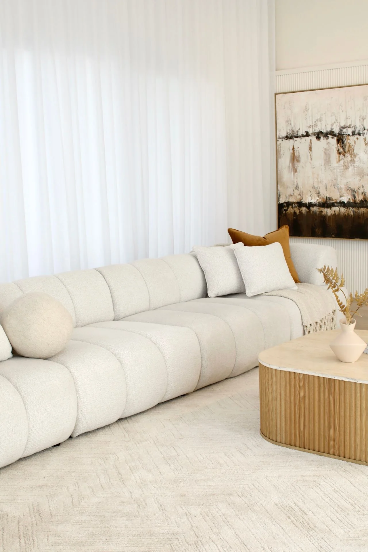 Designed for relaxation and contemporary style, the Savannah 4 Seater is fully customisable modular lounge. Upholstered in premium woven fabric in a white Vanilla hue. This on trend marshmallow style sofa boasts exquisite vertical tufting and a low-slung design to enhance its modern aesthetic. Featuring high-density foam seating and a spring base, offering incredible support with luxurious comfort.
