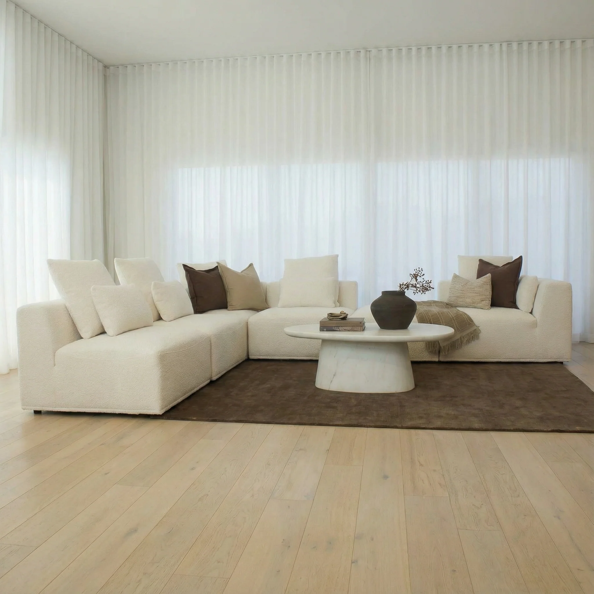 The Verona 6 Seater Modular Lounge redefines modern elegance in a spacious, modular format. Upholstered in sumptuous Cloud Optical white fabric, its crisp lines and sleek silhouette bring a refined contemporary touch to any room. Generously proportioned with high-density foam cushions and a resilient spring base, Verona delivers lasting comfort and support without compromising its structure. Fully modular and customisable, this six-piece lounge adapts effortlessly to your space, offering both timeless style and versatile living for everyday life.